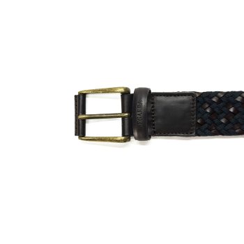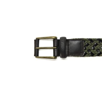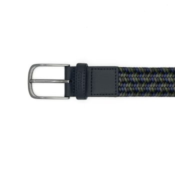 Cinturón elástico trenzado en tonos verde militar y azul marino, con punta y trabilla de piel sintética. Diseñado para ofrecer la máxima comodidad y adaptabilidad sin renunciar al estilo. Ideal para looks casuales o smart-casual, es ese detalle que eleva cualquier conjunto.