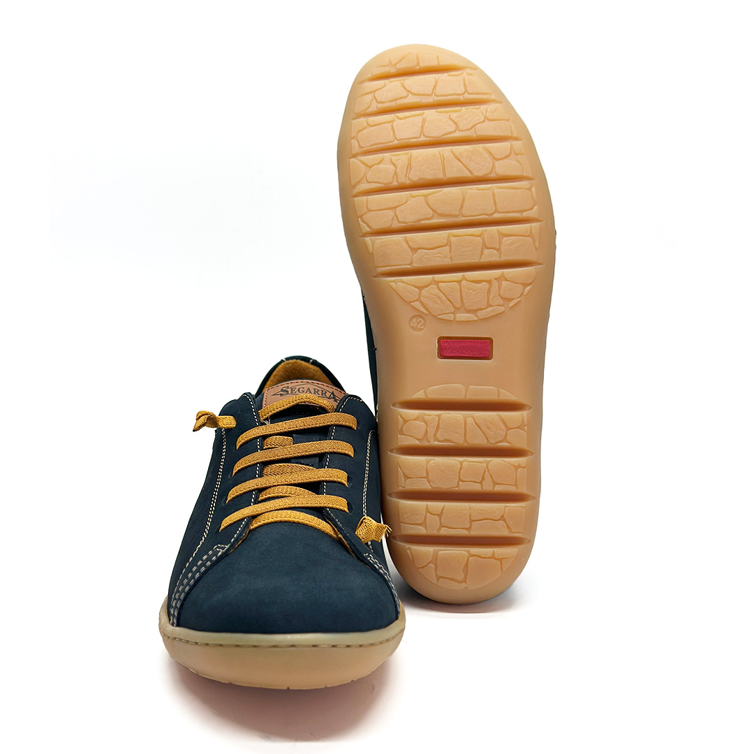 La Segarra 9016 Marino representa el equilibrio perfecto entre diseño contemporáneo y esencia artesanal. Fabricada en piel nobuck hidrófuga, esta zapatilla repele el agua y la humedad sin perder transpirabilidad, manteniendo el pie seco y confortable durante todo el día. Su tono marino, combinado con los cordones color mostaza, crea un contraste elegante y moderno que refleja la autenticidad del estilo Segarra.