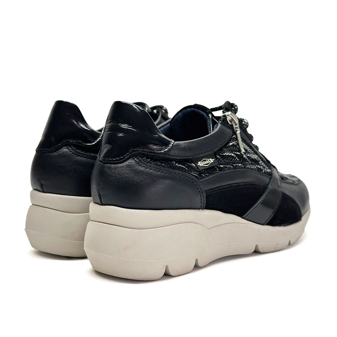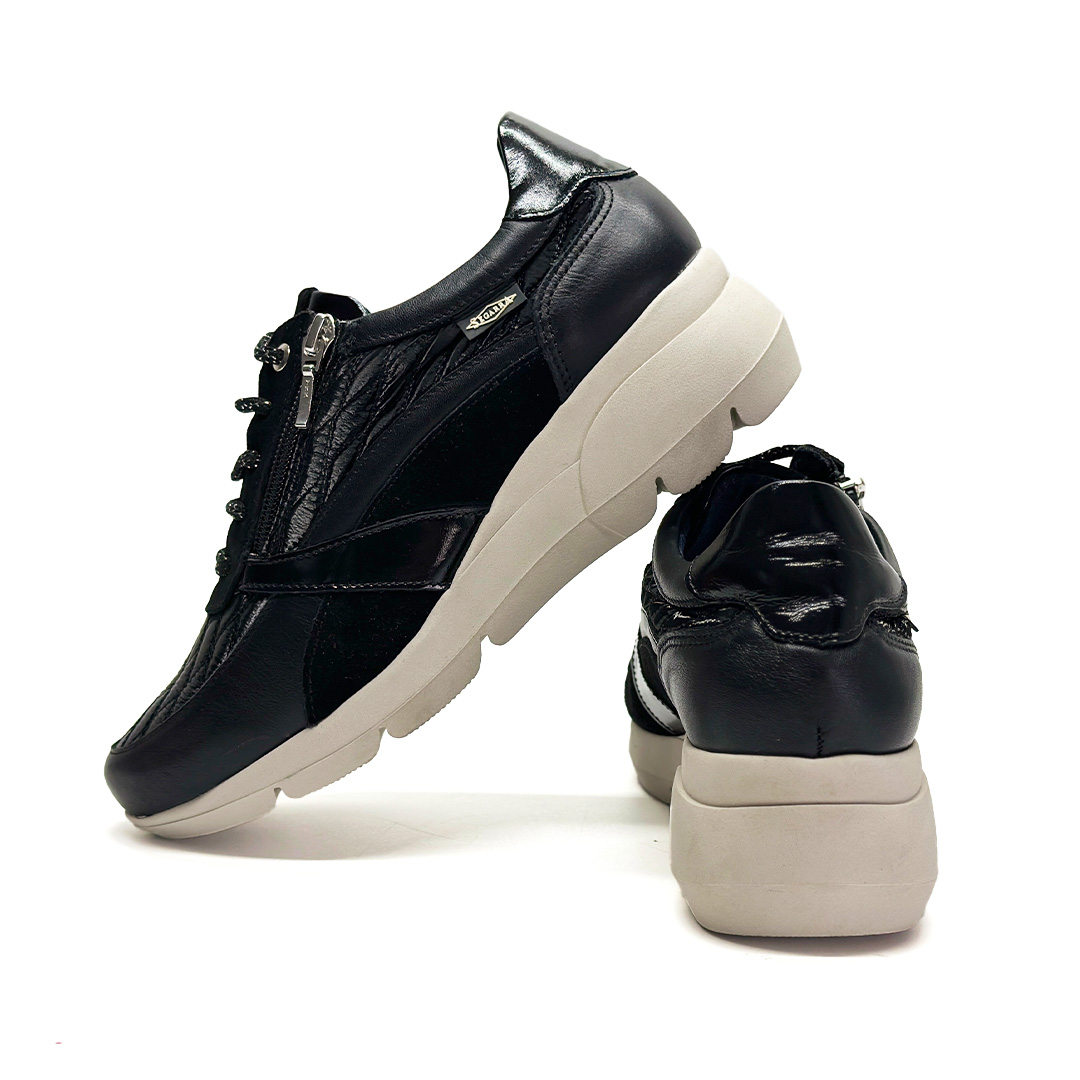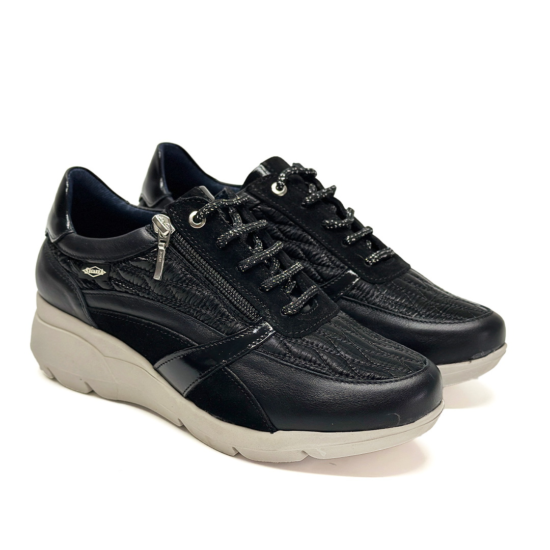 La Segarra 9052 Negro fusiona elegancia y confort en un diseño contemporáneo que realza cualquier look. Su acabado en piel negra con combinaciones de texturas —charol, nobuck y piel grabada— le aporta un toque sofisticado y actual, mientras que la suela clara tipo plataforma añade altura sin renunciar a la comodidad. Es una zapatilla urbana con alma moderna, perfecta para quienes buscan estilo y bienestar en cada paso.