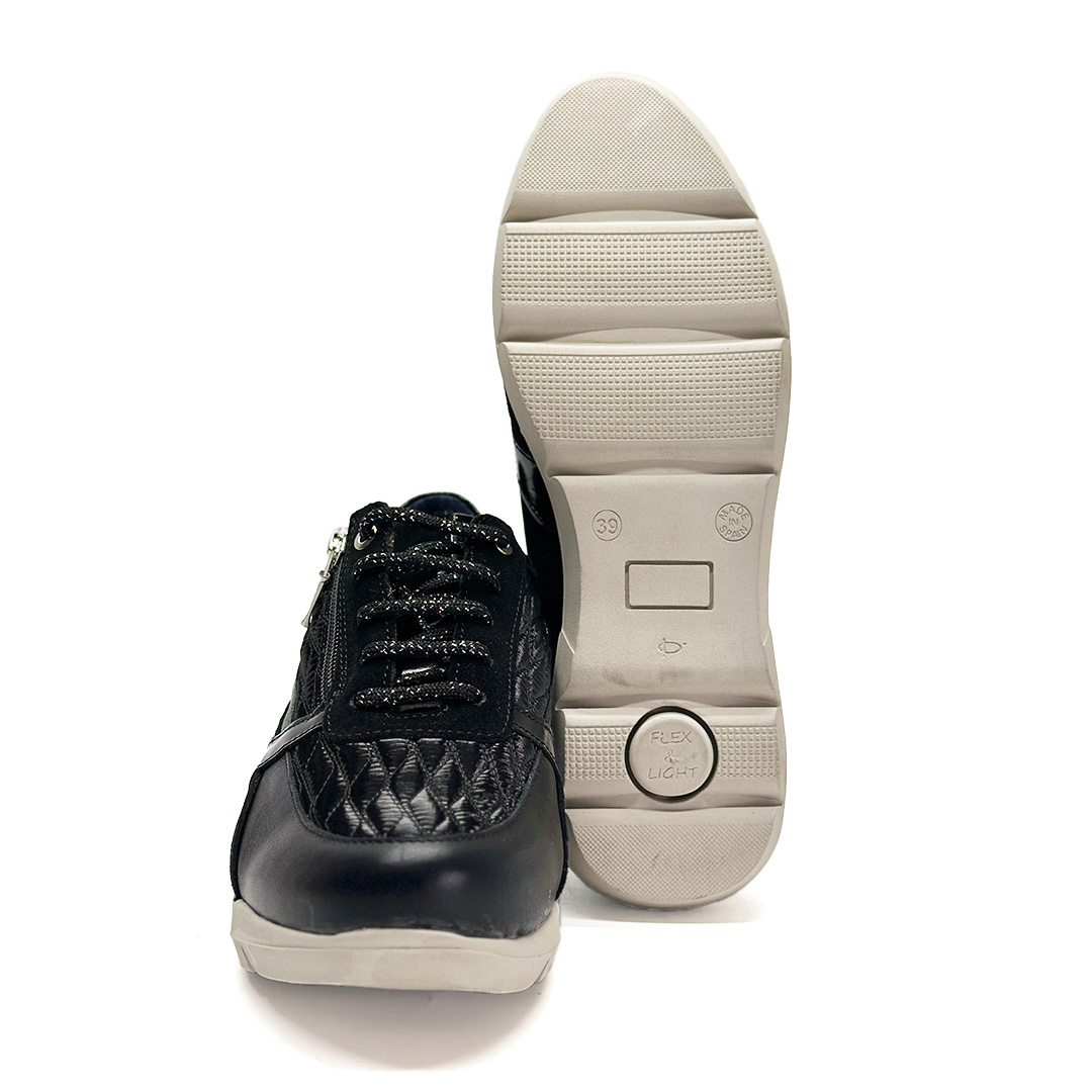 Fabricada en España con materiales de primera calidad, cuenta con una suela Flex Light, ligera y flexible, que proporciona amortiguación y confort durante todo el día. Incorpora cremallera lateral para facilitar el calce y cordones para un ajuste perfecto. Su interior suave y transpirable, junto con la plantilla acolchada, garantizan una sensación de ligereza incluso tras largas jornadas.