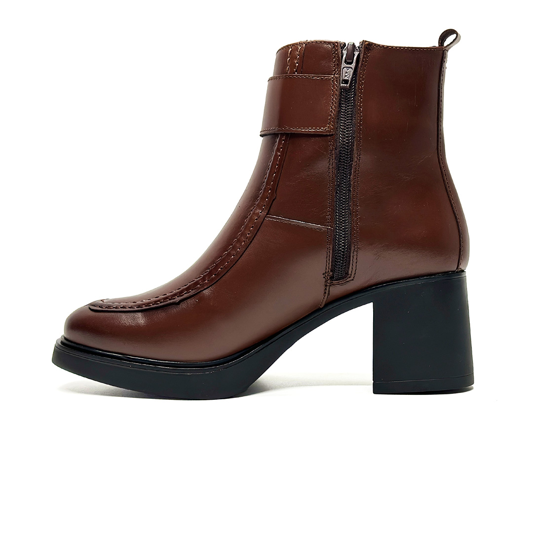 Confeccionado artesanalmente en España, este botín destaca por su corte limpio y estructura sólida, que estiliza la silueta del pie. Su tacón ancho aporta estabilidad y comodidad, mientras que la cremallera lateral facilita el calce sin renunciar al diseño.